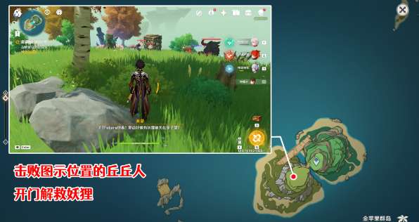 6、上山能够看到有个笼子里面关着妖狸,将丘丘人全都击败。