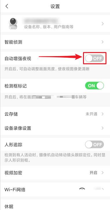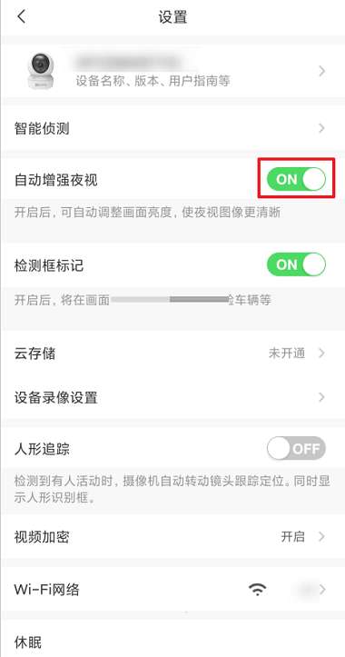 第三步:在“设置”界面,把“自动增强夜视”右侧开关打开即可,如图所示。