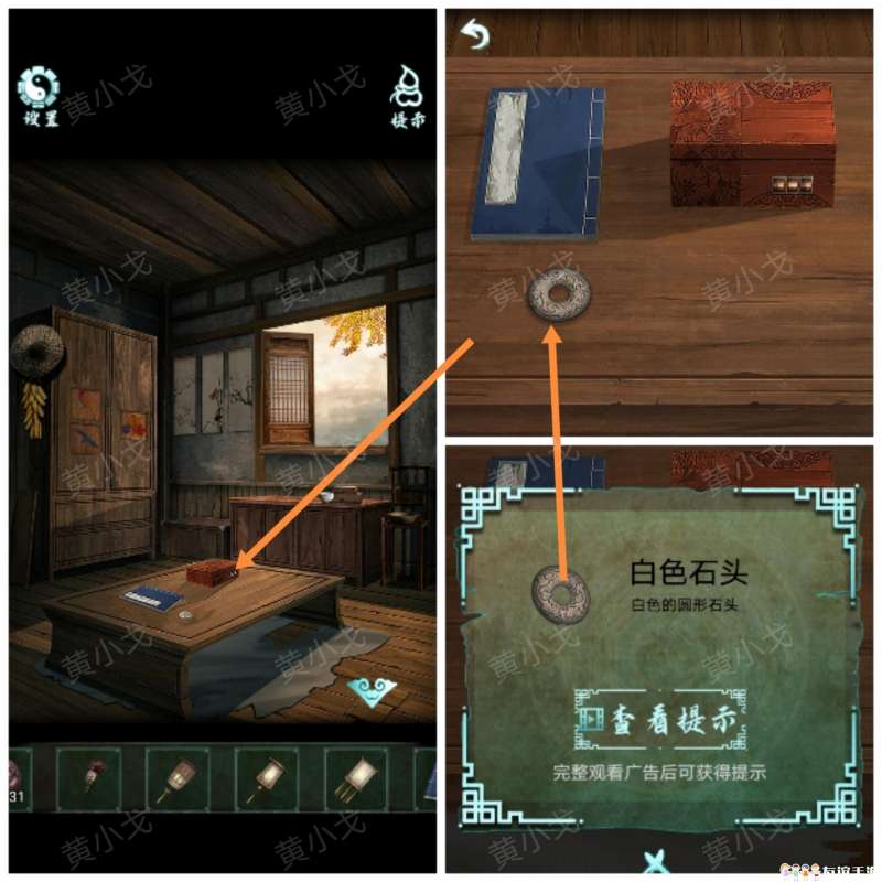 16.(老屋-里屋)点击桌子,获得【白色石头】
