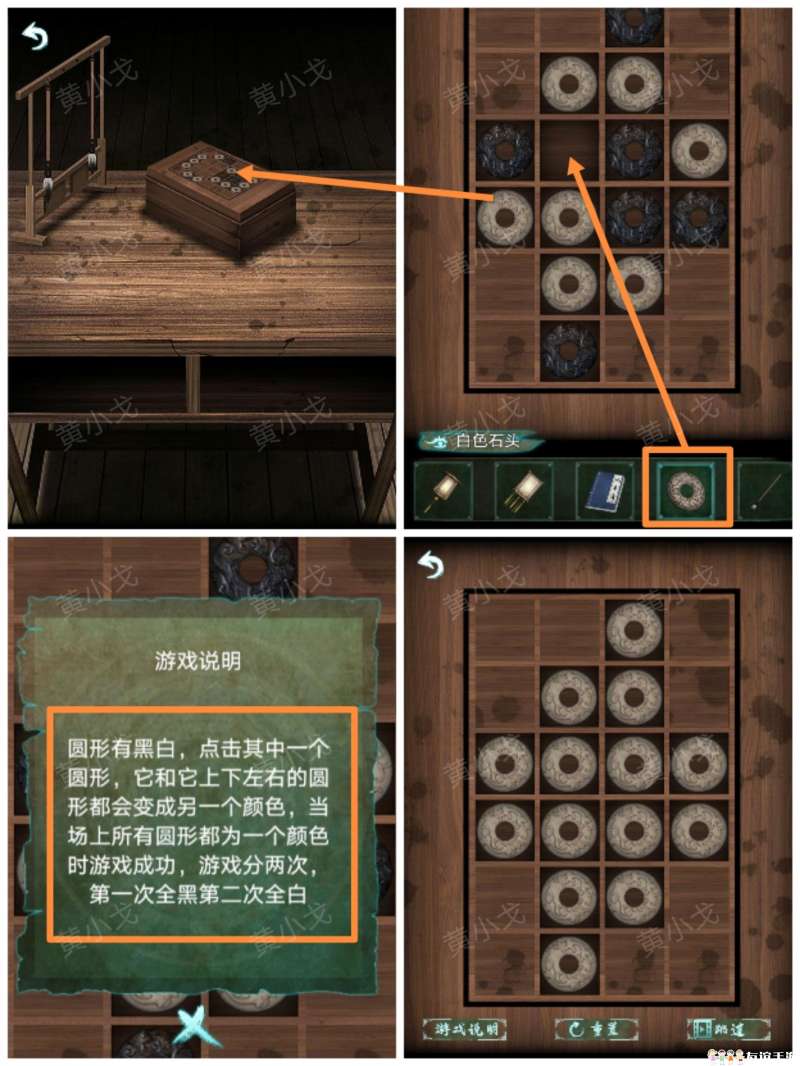 2.点击桌子上的盒子,放入【白色石头】;查看游戏说明,完成石头变色小游戏(两局,一局全黑,一局全白)