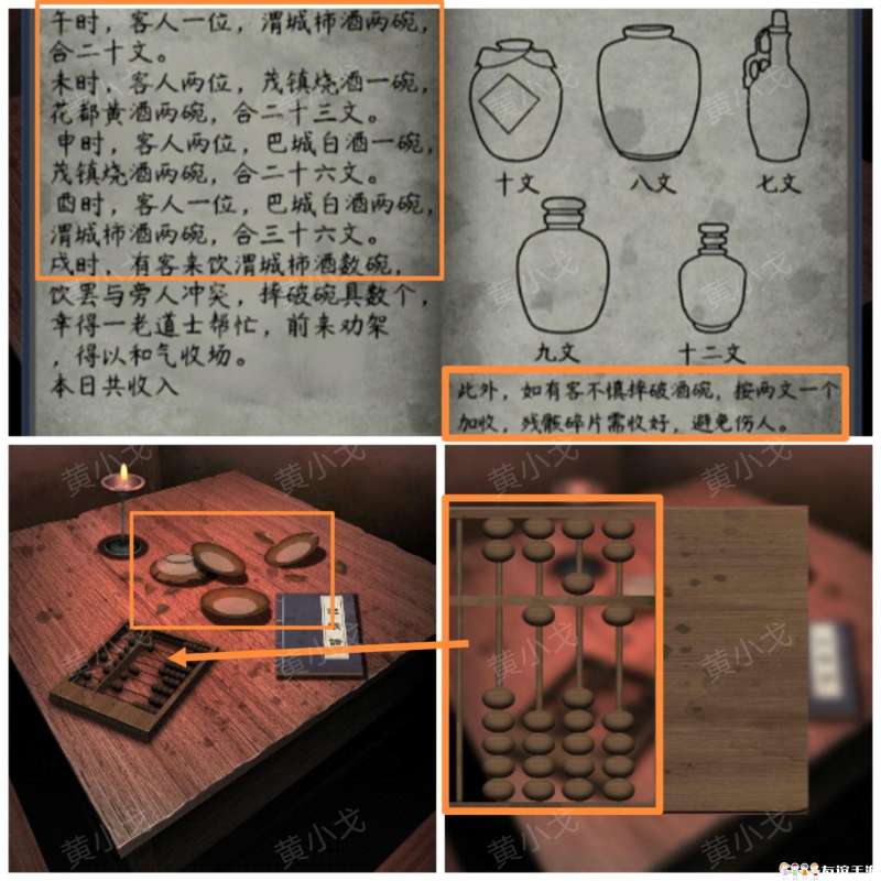 4.点击算盘,根据账簿上的线索,加上桌子上的碗,算出本日收入(