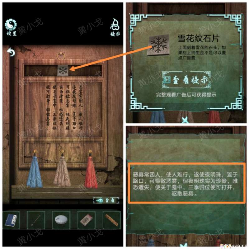14.打开暗格,获得【雪花纹石片】,查看刻字
