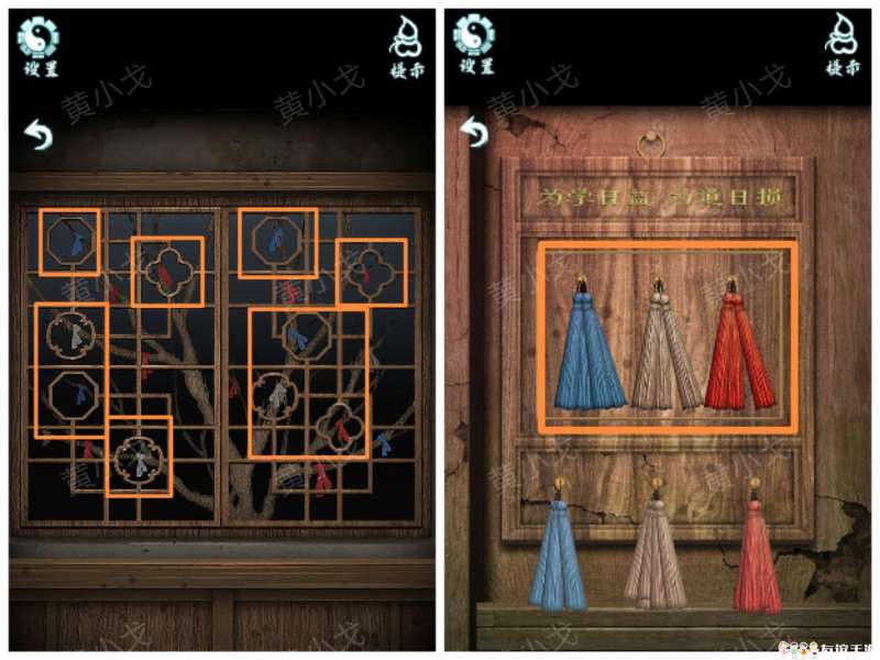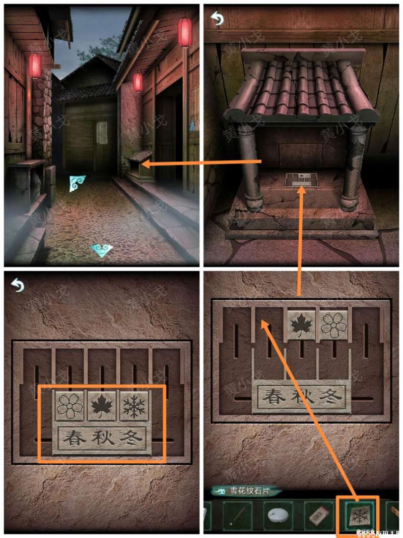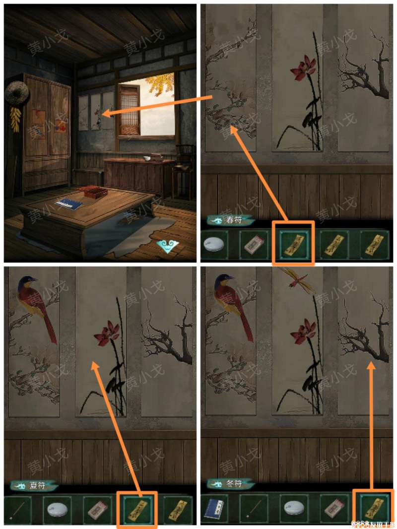 21.(老屋-里屋)点击墙上的挂画,根据上面的植物分别贴上【春符】、【夏符】和【冬符】,获得线索