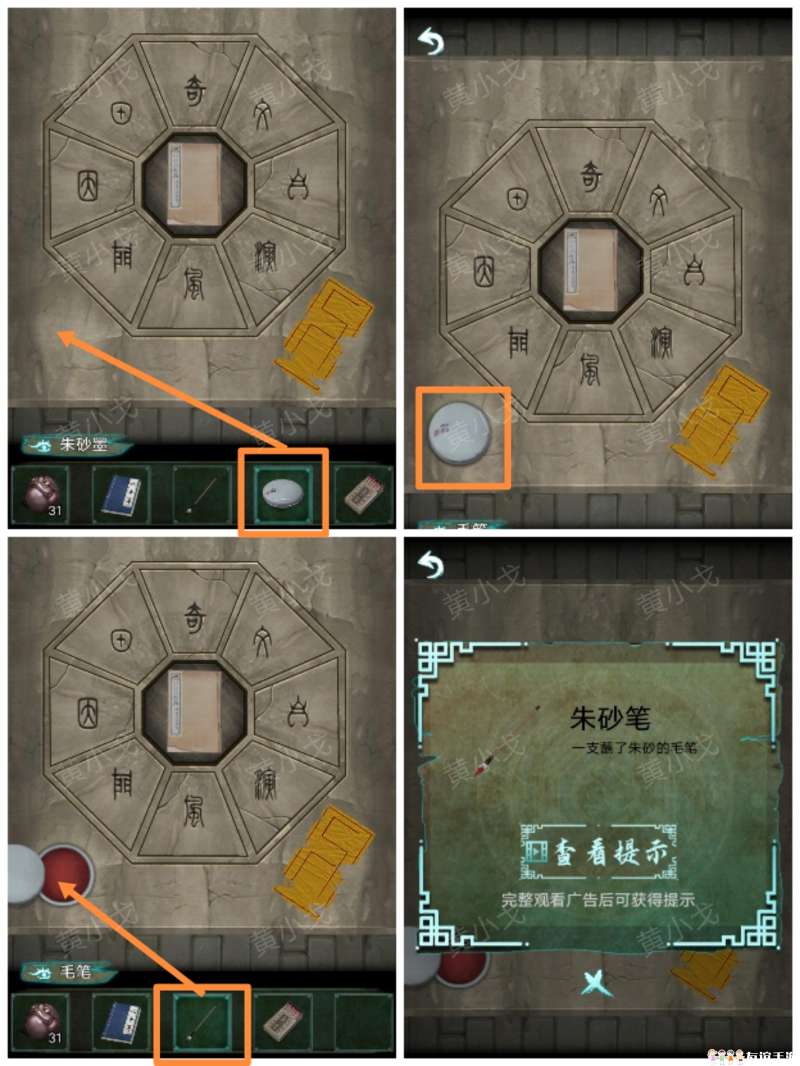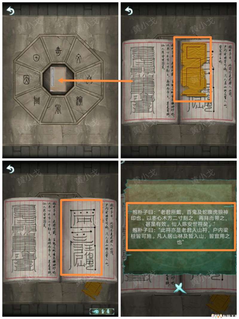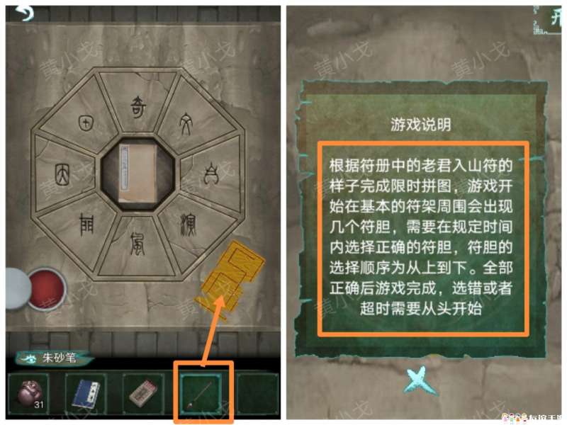 21.用【朱砂笔】画符;查看游戏说明,根据书上的符咒样式,完成小游戏