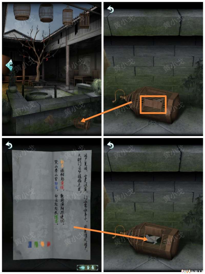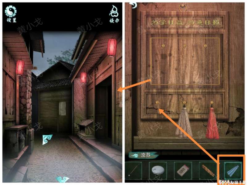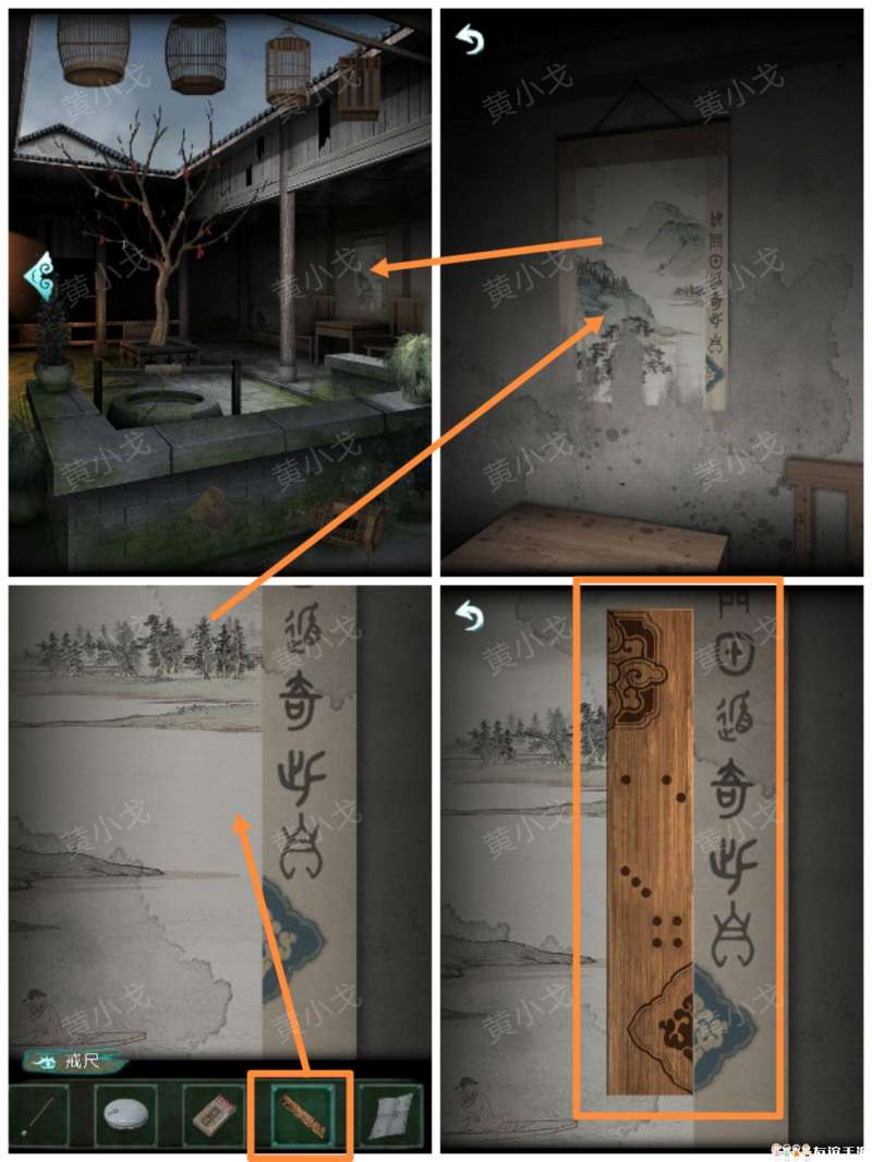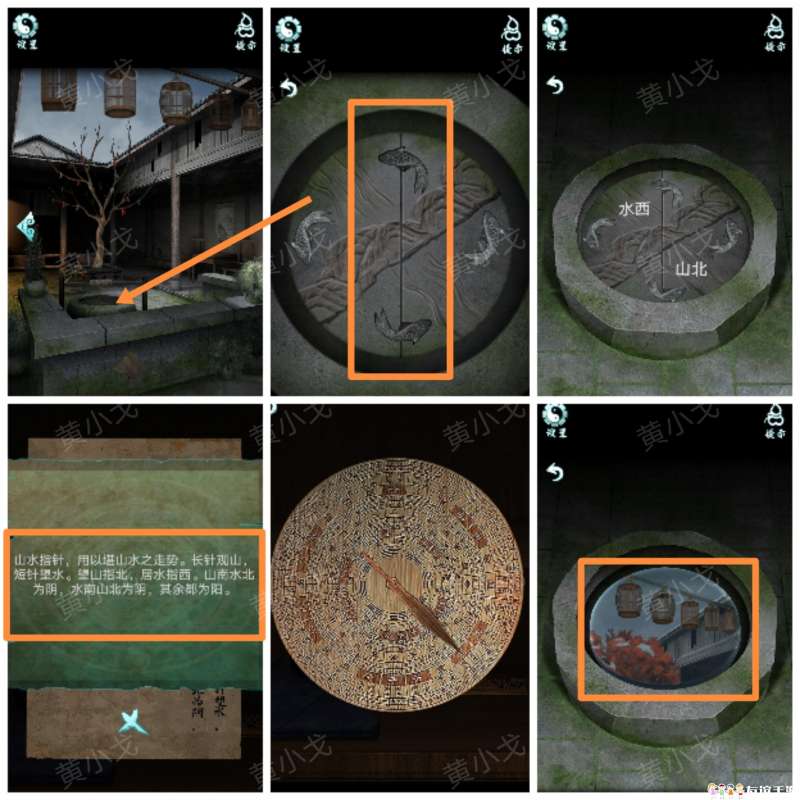 6.(院子)点击水井,根据纸条上的线索和罗盘上的短针个长针的指向,找出方位;按下中间两条鱼为阴,触发剧情,在水井里获得灯笼排列位置