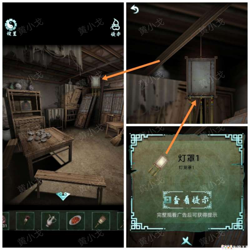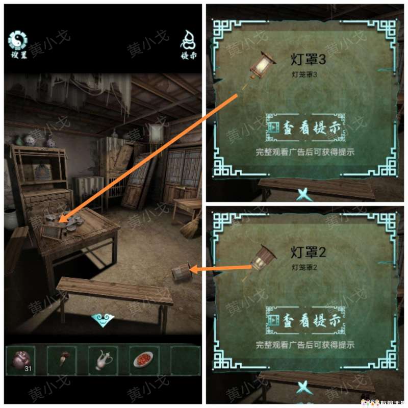 9.(老屋-大厅)点击拾取地上的【灯罩2】;桌子上的【灯罩3】