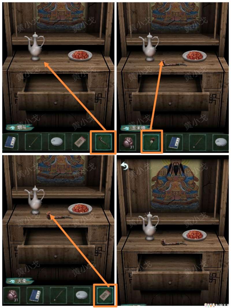 19.(老屋-大厅)点击佛龛,放上【烟斗】,把【玉米穗】放入烟斗中,用【火柴】点燃