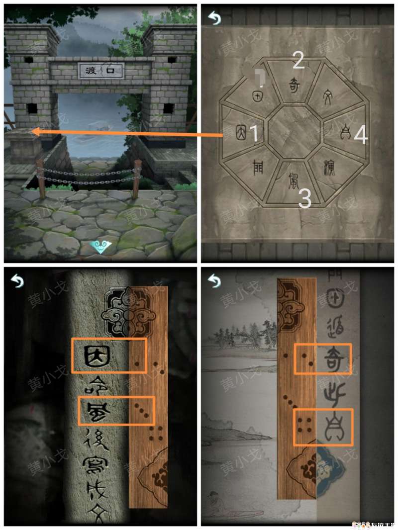 18.(渡口)点击石台,根据挂画和土地公石庙上的线索,按顺序按下字石块