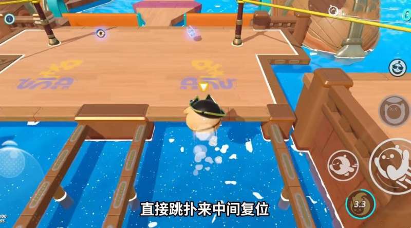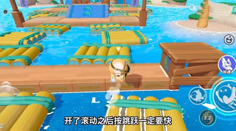 4、直接跳扑来中间复位,开启滚动,就能够稳稳的赶上右边浮木;