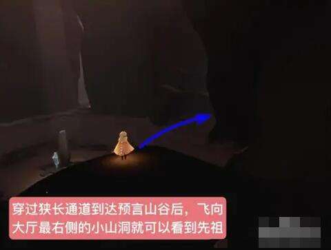 2、然后我们穿过通道到达预言山谷,飞到大厅最右侧的小山洞中即可看到火先知先祖。