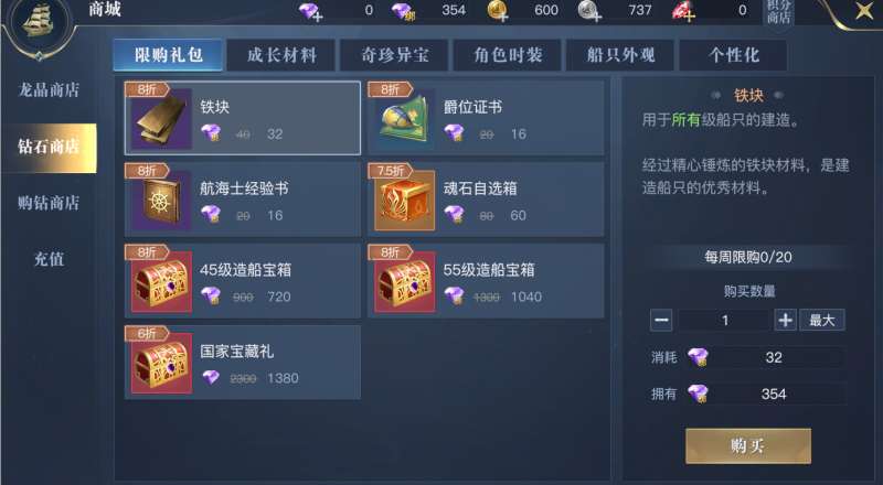 在钻石商店中可以花费32个砖石购买铁块,每周限购20块。