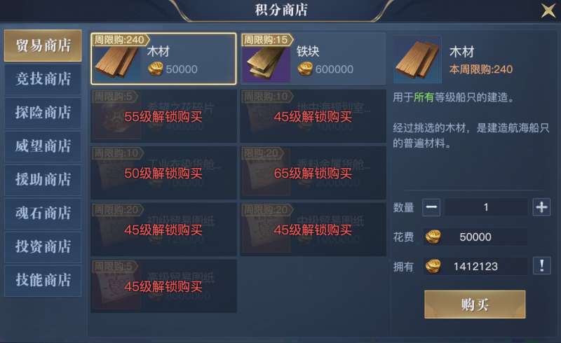 在贸易商店内可以花费5万贸易币购买木材,每周限购240个。