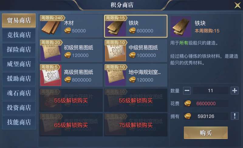 在贸易商店内可以花费60万贸易币购买铁块,每周限购15块。