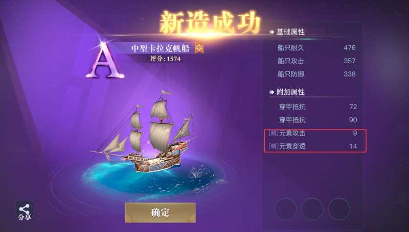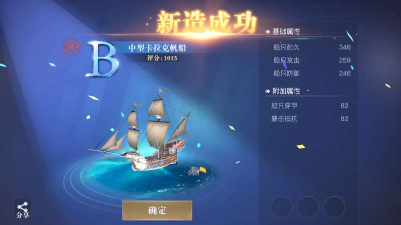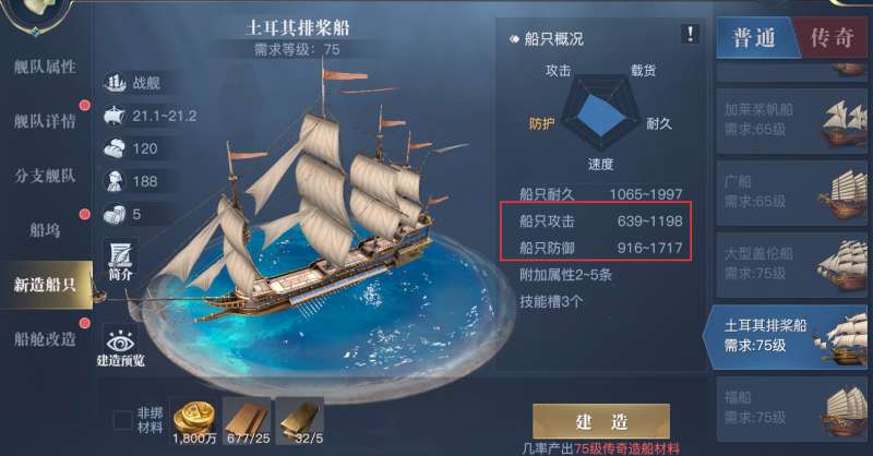 2、船只级别总共分为B、A、S、SS。B级船在建造中必出,属性最差。A级与S级船建造几率较低,属性较高带有附加属性。最高级的SS级船只,需特殊材料直接建造,是当前等级最高战舰!