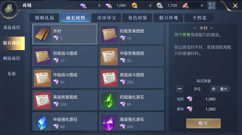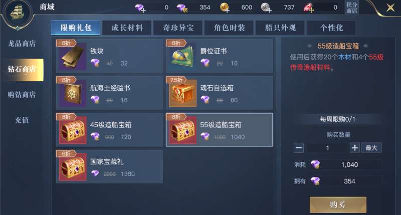 钻石商城限购礼包分栏中有对应等级的造船宝箱,开启后可获取相应等级的传奇造船材料。(每周限购一次)