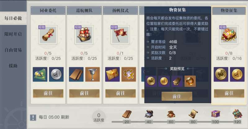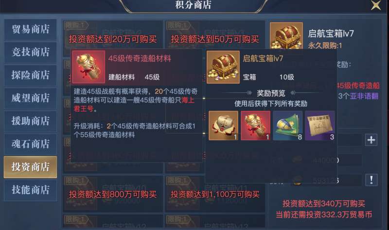 当投资额度达到要求时可以花费贸易币购买相应的启航宝箱,开启宝箱可获得传奇造船材料,限购一次。