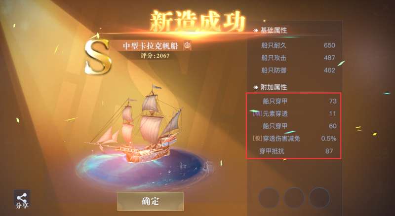 S级战舰的打造几率极低,会多出额外的随机2-5条附加属性和整体属性提升,由于前期升级较快,所以不必浪费赌低等级S战舰。