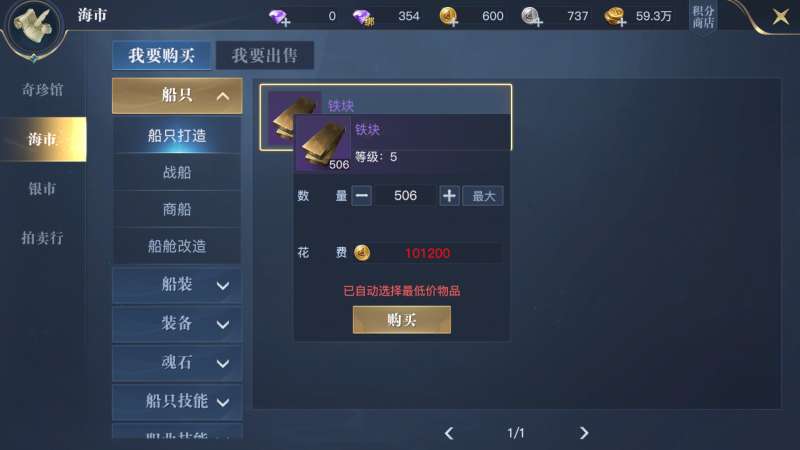 当我们等级大于5时通过海市中的船只打造购买到我们需要的铁块(无限制购买)。海市中要注意是否有库存!