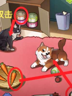 1、进入游戏我们双击打开柜子将罐头喂猫、胡萝卜喂兔子、地上的狗粮喂狗;