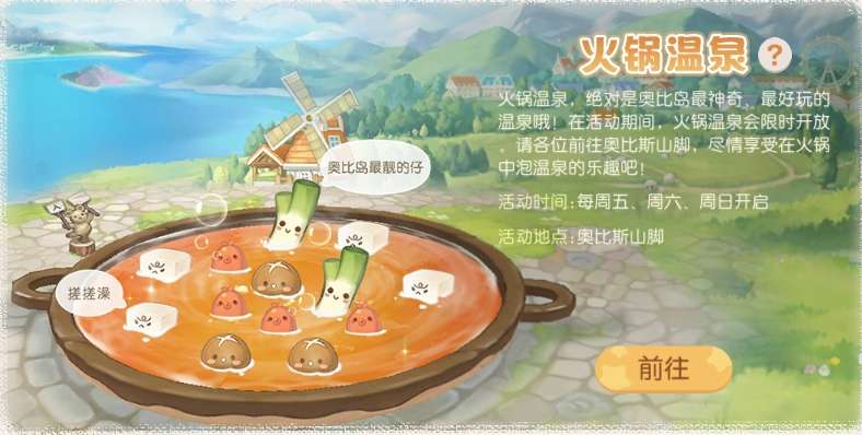 活动开启期间,火锅温泉在奥比斯山脚限时开放。点击温泉区域或者温泉旁的小熊计数员即可进入温泉,点击温泉外的区域即可离开温泉。