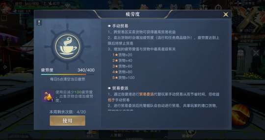 了解完贸易的基础玩法流程后,我们来看看贸易系统中另一大重要指数:疲劳值。