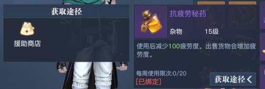 当然,也有疲劳值不够用的时候。当我们疲劳达到上限后仍想要进行贸易时,可以使用抗疲劳秘药减少100疲劳,我们可通过援助商店购买、完成特定任务、挑战港口三种途径获取抗疲劳秘药。援助商店花费100援助值即可购买抗疲劳秘药,每周限购10瓶,每位我们每周可抗疲劳秘药同样也有上限,每周最多使用20次抗疲劳秘药。