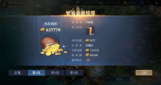 在每日疲劳值的规划上,这边比较推荐我们先贸易当前能贸易的最高星级商品,既能快速贸易,一次性获取大量贸易币,也能快速消耗疲劳。当我们疲劳已不足以贸易最高星级商品时候再贸易低星级商品,努力用光每一滴疲劳值!