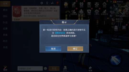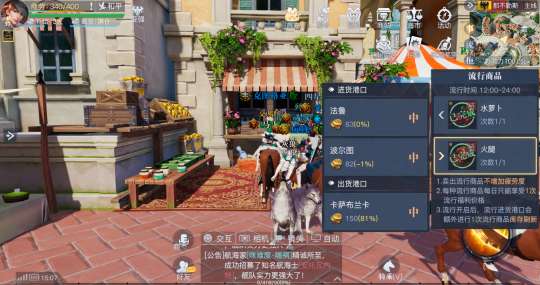 每天的12点至24点贸易系统将触发一个贸易的独特内容:“流行贸易”,游戏每天的12:00将开启“流行竞猜”,我们可在世界频道竞猜当天的流行货物,若竞猜成功将可以获得50绑钻的奖励!