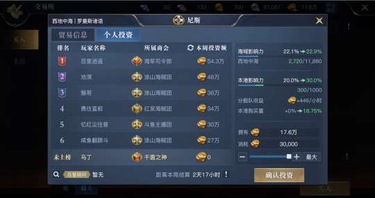 我们可点击下方“前往投资”进入个人投资界面消耗贸易币进行投资,投资除了能提升本港影响力、解锁本港购买货物、本港购买量外,还能增加海域影响力、分舰队收益。推荐大家在贸易币充盈的情况下,将每个港口的影响力都拉到100%,既增加海域影响力还能最大化收益。