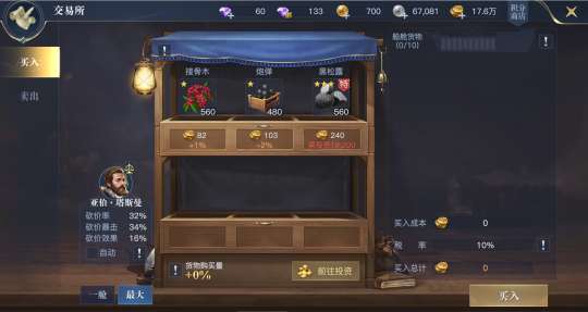 与我们手动贸易相同“托管贸易”同样会增加我们疲劳,并且托管贸易的货物价格、货物数量、税率、消耗疲劳度这类数值都与手动贸易一致,但利润收益将会有所减少,一级商贸码头仅可获取80%的利润。所以在我们能够手动贸易的情况下还是手动贸易为好,在十分忙碌的情况下可以使用托管贸易降低损失。