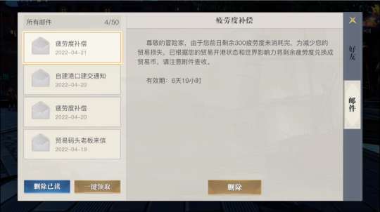 我们今日没用完的疲劳值不可积累到第二日,系统将在第二日的早晨5点重置疲劳。所以还是比较推荐大家将每天的疲劳都用完的,当然如果没用完的话也不要懊恼,官方第二日重置疲劳值后,将会根据我们未使用的疲劳值数量来发送邮件补偿我们一定的贸易币。