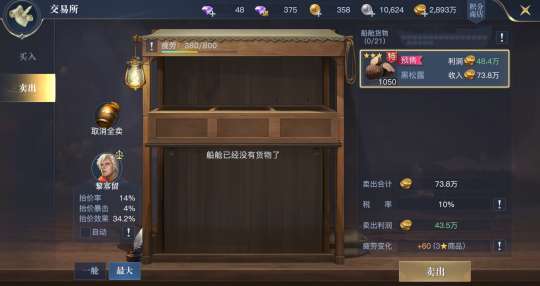 寻路航行到达当地的交易所老板处,点击“卖出”—“全卖”即可卖出货仓内的货物获取贸易币,这样就完成了一次普通贸易了。所有卖出货物的基础税率都是默认10%,我们有三种方式可以降低该港口的税率:航海士技能、总督顾问排名奖励、商会投资战。