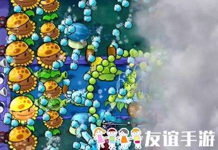 4、然后在左侧补充第二列阳光向日葵,根据情况使用寒冰豌豆菇。