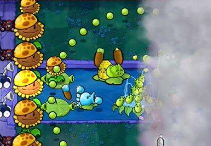 3、在泳池中种植一个豌豆荚许愿池,在许愿池前种植两个高兵菇。