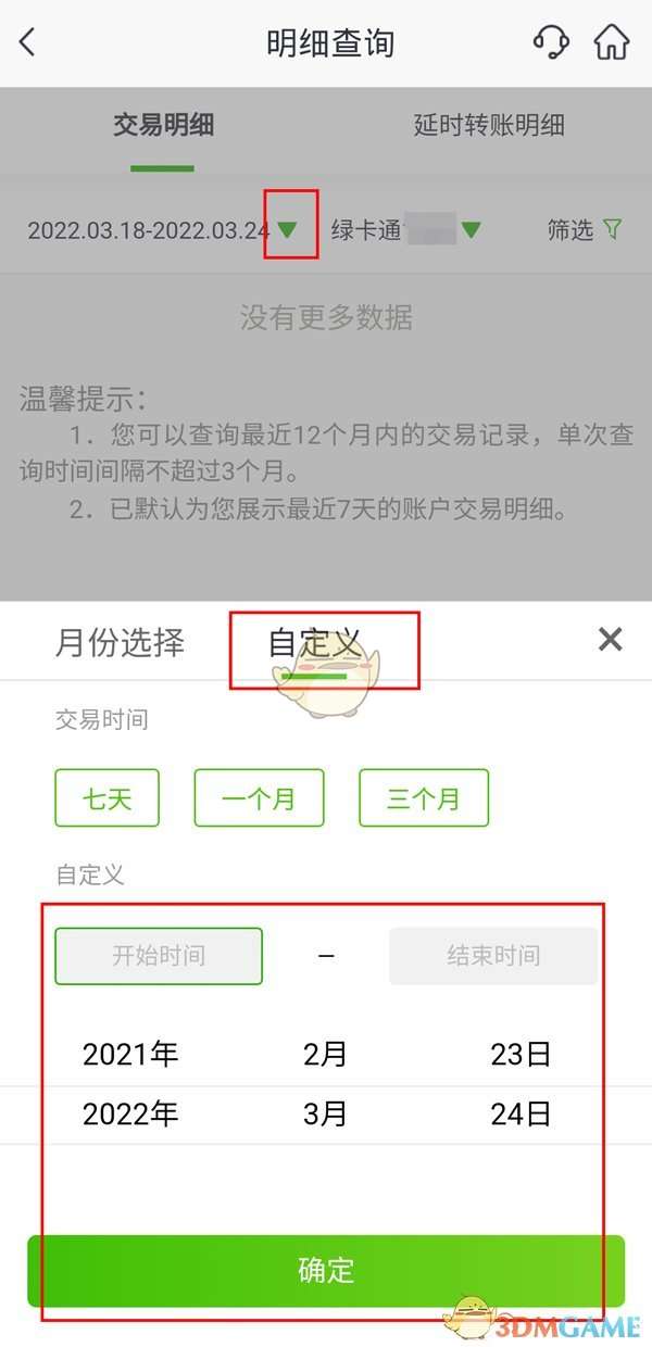 2、点击时间右侧的倒三角图标,选择需要查询交易明细的时间范围。