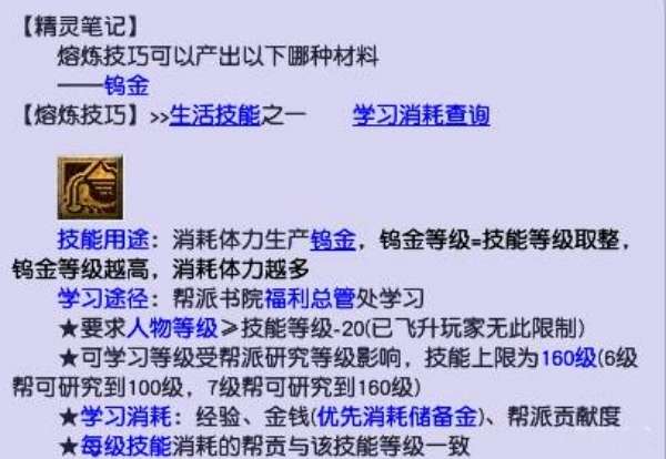 2、熔炼技巧属于生活技能的一个,玩家可以通过熔炼技巧生产钨金。