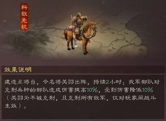 【料敌先机】为加强类计策,武圣关羽的计策同样重进攻,与吕布不同的是,关羽计策重在“强者更强”,兵种克制将克制得更狠,更大的优势产生压制效果,战斗滚雪球会更快。