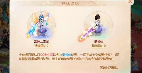 3、单人也可完成情缘任务,单只获得单人情缘积分,可以与未完成的人结缘一起完成,获得满额情缘值。
