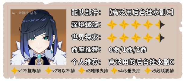 夜兰的话也是建议抽取的,毕竟夜天后的名号不是说来就来的,实际在测试的时候夜兰的手感真是嘎嘎爽。另外夜兰独特的增伤机制也是嘎嘎强,不过这个增伤是不计入角色面板的。夜兰作为水系的后台数次,搭配火C使用可以配合主C打出不错的配合。夜兰自身伤害其实也不低,如果配合的好,先于主C完成控场压制也是可行的。
