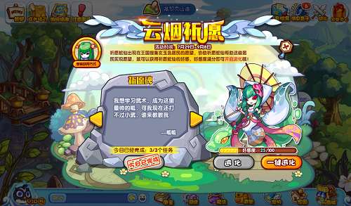 洛克王国游戏中祈愿蛇仙推荐配招:闺怨+病入膏肓+玄武无敌+月灵护盾。7月29日~9月8日参与云烟祈愿活动,每天祈愿碑会刷新三个任务,每完成一个小任务可获得一定的好感度,累计100活动进度可获得祈愿蛇仙的进化资格。