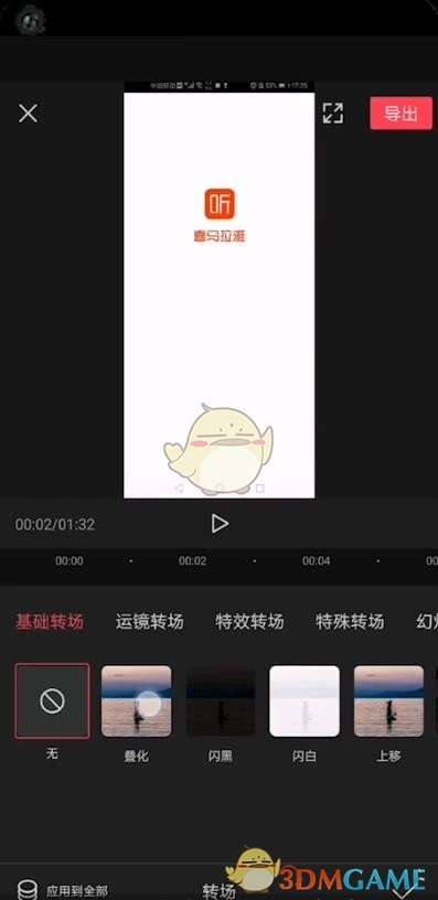 2、便能看到各种转场特效,其中叠化转场是基础转场中的第一个。点击叠化,然后点击右下方的勾号,叠化转场便添加成功啦。