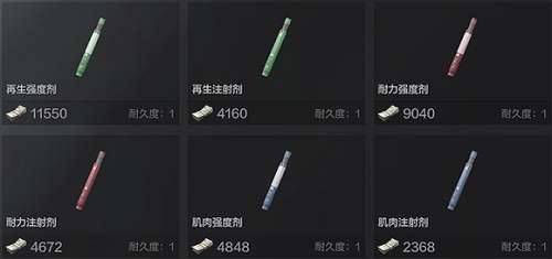 5、下面就是增益药品了。再生剂可以让玩家获得持续回复健康值的再生效果。耐力剂则可以让玩家获得兴奋效果。而肌肉剂则可以让玩家获得提高负重上限的坚毅效果。