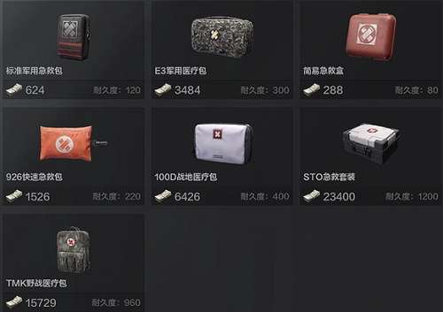 4、医疗包如下图所示,共计七种。使用医疗包,即可回复玩家的健康值。不过,不同的医疗包回复健康值的速率、启用速度、消耗水量不同。最后的STO急救包、TMK野战医疗包不仅能回复健康值,也可以治疗创口状态。