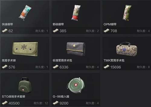 2、下图中的伤害救治药品从用途上可分为绷带、手术包、吸入器三种。前面说的创口也就是流血状态,就可以使用绷带治疗。手术包可以用来治疗损坏状态。当玩家使用手术包时,玩家不可移动。并且,只有使用STO战地手术套装才能恢复部位的正常状态。其他手术包,用完之后就会扣除部位健康值上限,特别是简易手术袋,简直是截肢。对了,使用手术包时,千万记得找一个安全的地方,因为使用用手术包时不可移动!