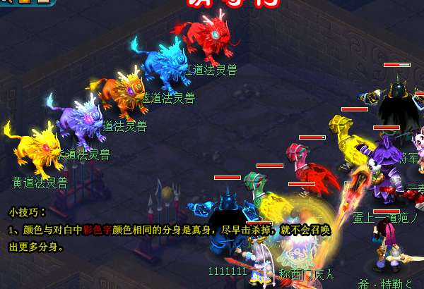 小贴士∶1、颜色与对白中彩色字颜色相同的分身是真身,尽早击杀掉,就不会召唤出更多分身。。