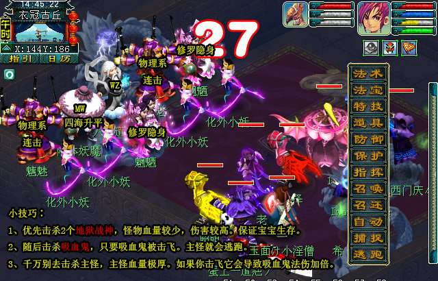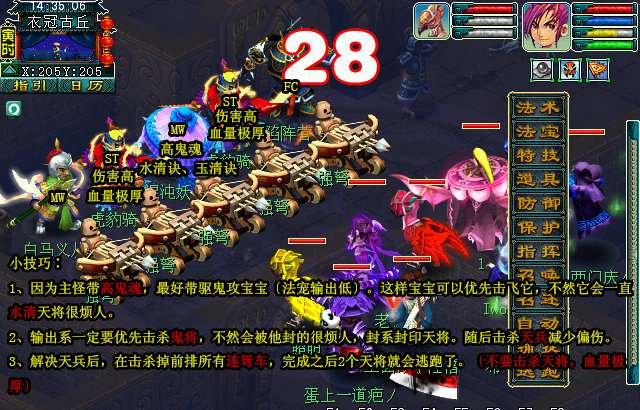 2、输出系一定要优先击杀鬼将,不然会被他封的很烦人,封系封印天将。随后击杀天兵减少偏伤。