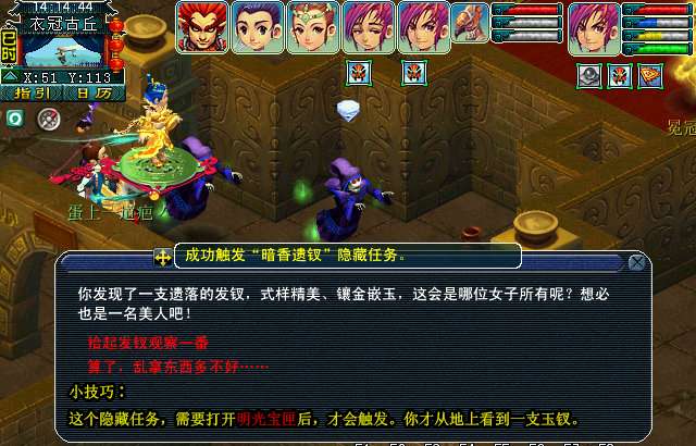 玩家可以在〔51,131〕的地面上找到一支玉钗。触发隐藏任务暗香遗钗。