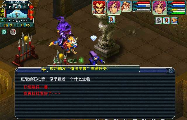 玩家可以在〔194,73〕找到一根蟠龙柱,点击触发道法灵兽隐藏任务。