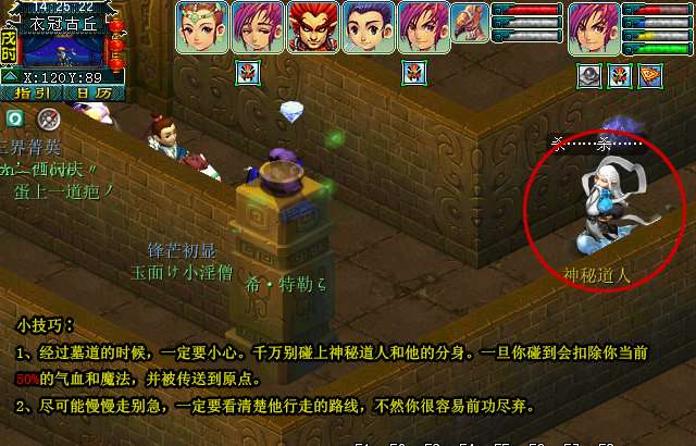 1、经过墓道的时候,一定要小心。千万别碰上神秘道人和他的分身。一旦你碰到会扣除你当前50%的气血和魔法,并被传送到原点。