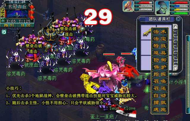 1、优先击杀2个地狱战神,怪物血量较少,伤害较高。保证宝宝生存。